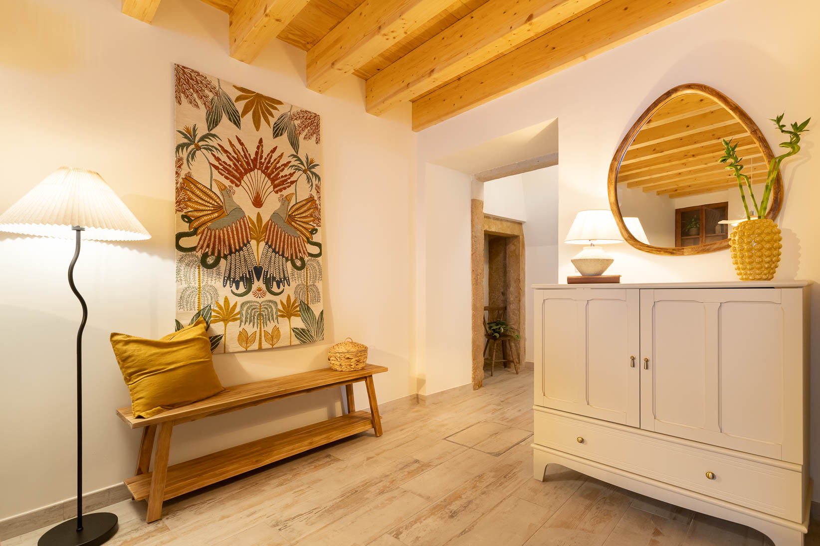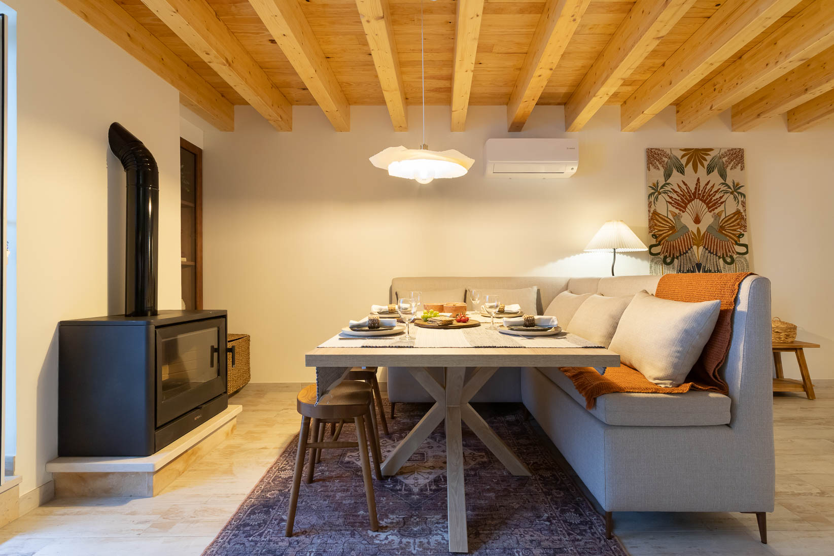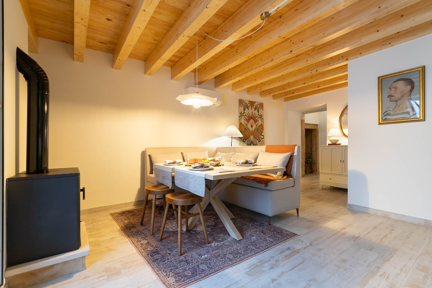 Foram preservados elementos estruturais e decorativos que marcam a história da casa, enquanto materiais, texturas e cores foram escolhidos para realçar a autenticidade e criar profundidade. O mobiliário e a decoração dialogam com a memória do espaço, resultando num ambiente harmonioso, confortável e pensado ao detalhe.